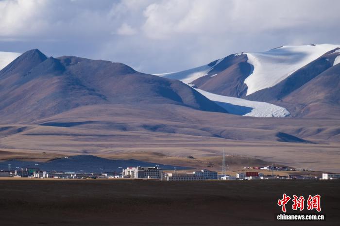 图为2024年10月2日,远眺西藏自治区那曲市双湖县城和县城附近的冰川。江飞波 摄
