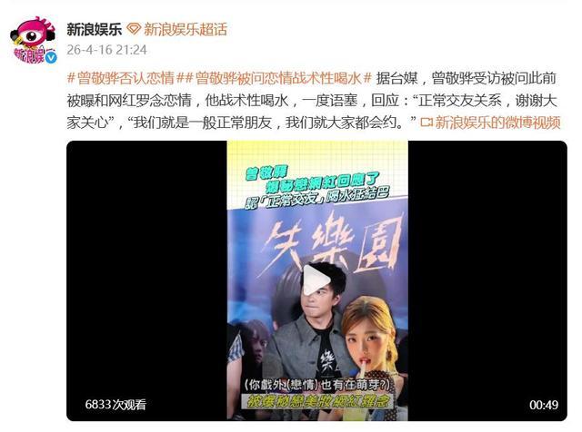 据4月16日晚间报道,曾敬骅在宣传新片时的回应,又贡献了娱乐圈一个经典的“战术性喝水”名场面。当记者直接追问此前被曝与网红罗念的恋情时,他当场语塞,随即举起水瓶战术性喝水,稳住阵脚给出答案:“正常交友关系,谢谢大家关心”,“我们就是一般正常朋友,我们就大家都会约。”